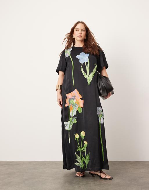 ASOS EDITION Curve - Sort T-shirt-maxikjole med blomsterbroderi i satin