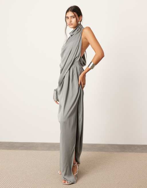 ASOS EDITION - Draperet, løstsiddende midikjole uden ærmer med halterneck i grå