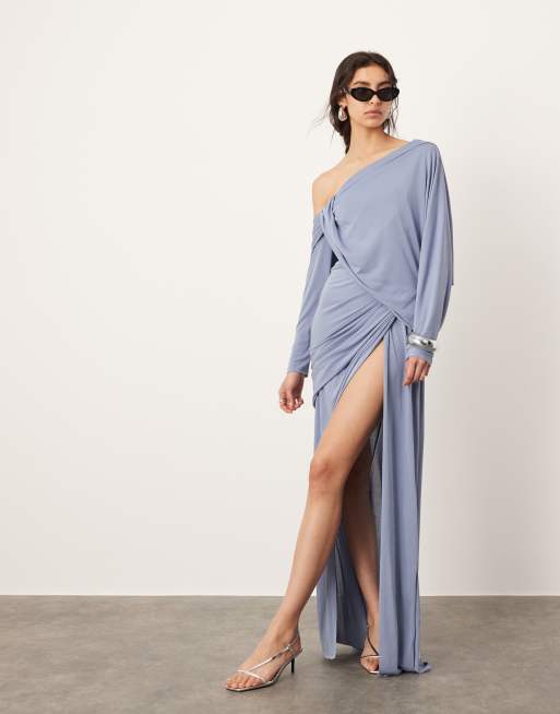 ASOS EDITION - Draperet offshoulder-maxikjole med detalje i taljen i blå