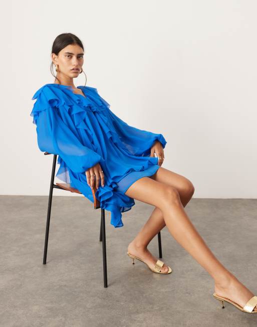 ASOS EDITION - Koboltblå minikjole med rå kanter og flæser i chiffon