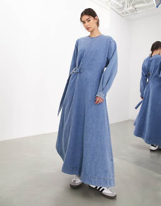 ASOS EDITION - Langærmet maxikjole i denim med mellemblå vask og D-ringsdetalje