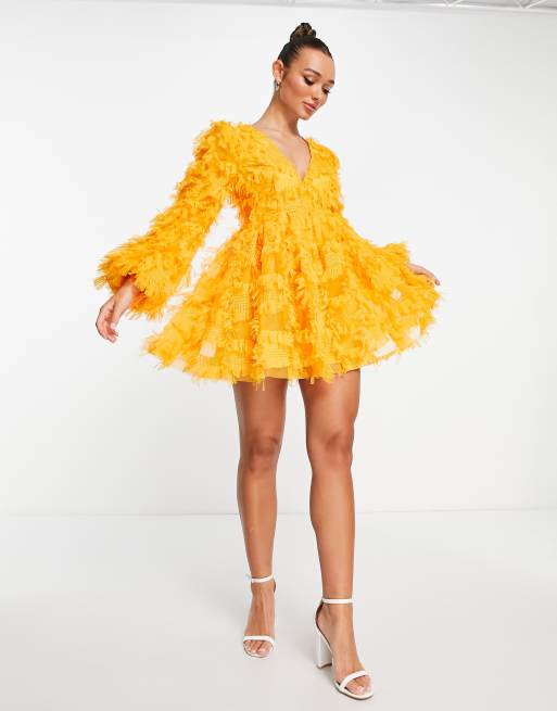 ASOS EDITION - Langærmet minikjole med V-hals i orange med tekstur