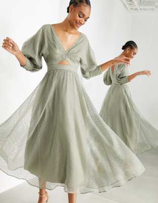 ASOS EDITION - Midikjole i ternet organza med blouson-ærmer i khakifarvet