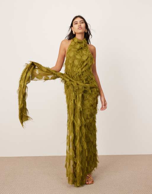 ASOS EDITION - Rynket og olivengrøn maxikjole med tekstur, halterneck og vandfaldsudskæring