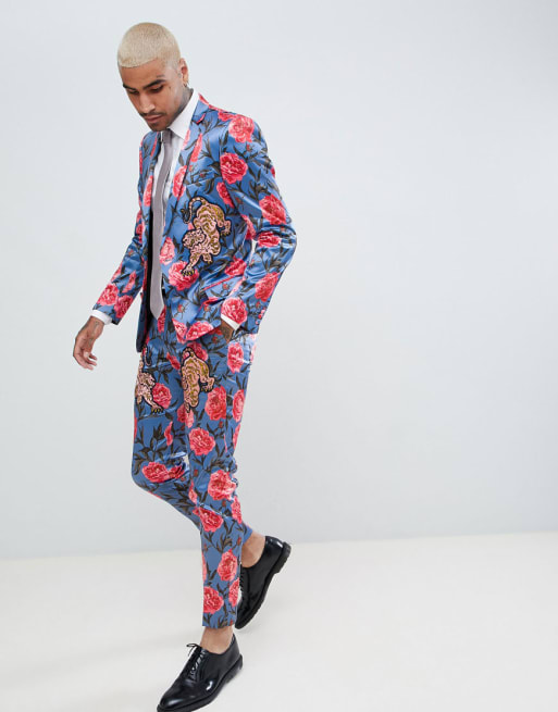 ASOS EDITION smal habit i blåt blomsterprint med tigerdetaljer