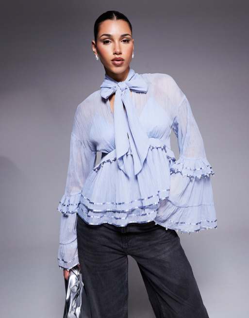 ASOS LUXE - Blå bluse med overdrevne ærmer og perleudsmykning i chiffon