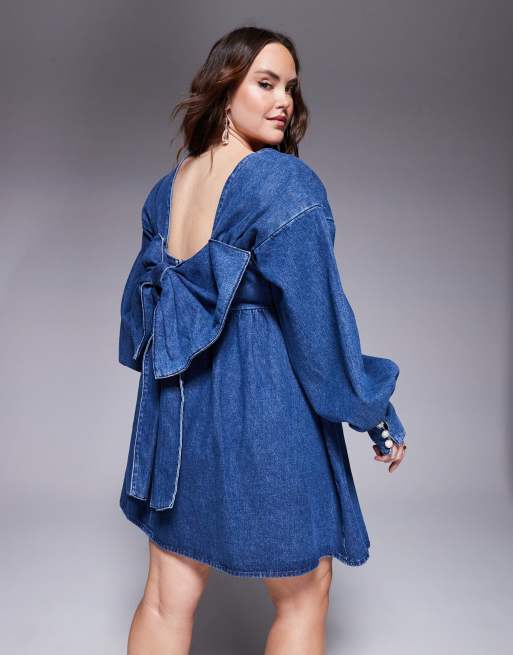 ASOS LUXE Curve - Langærmet og blå babydoll-minikjole i denim med sløjfe på ryggen
