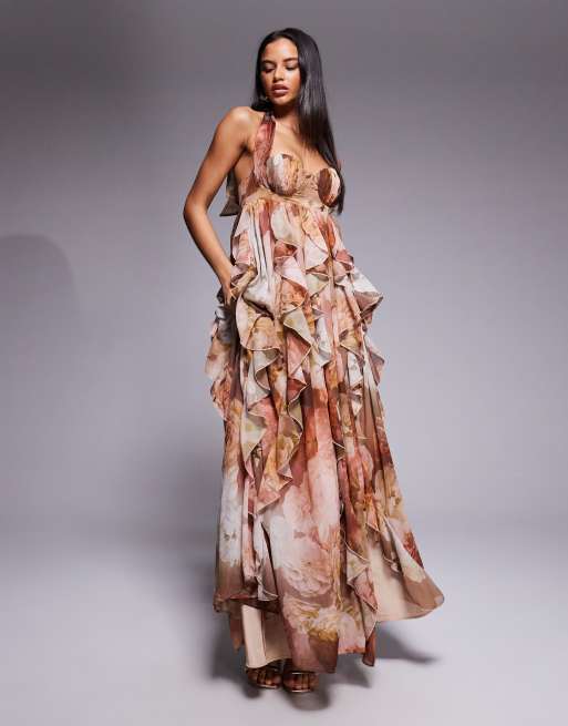 ASOS LUXE - Halterneck-maxikjole med vandfaldsflæser og brunt blomstermønster