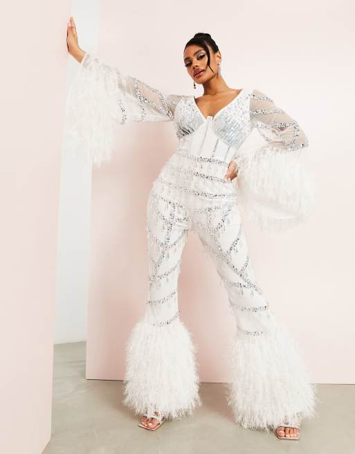 ASOS LUXE - Hvid jumpsuit med brede ben og imiterede fjerdetaljer
