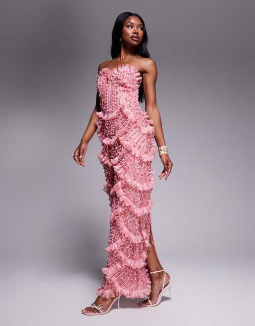 ASOS LUXE - Pink udsmykket bandeau-maxikjole med smykkesten og muslingekant