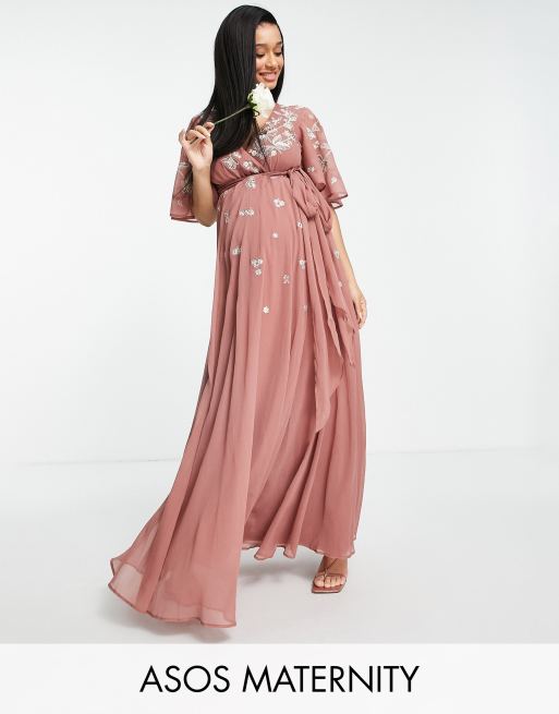 ASOS DESIGN Maternity - Brudepiger - Slå-om-maxikjole med flagermuseærmer og tonede blomsterbroderier