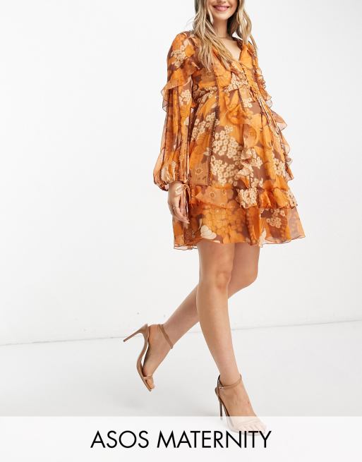 ASOS DESIGN Maternity - Flæsekjole i sennepsgult blomstermønster med flæser, knapper foran og blondedetaljer