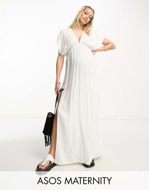 ASOS DESIGN Maternity - Hvid maxi-strandkjole med flagrende ærmer og indsyet talje