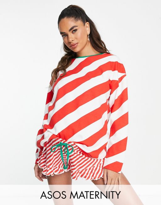 ASOS DESIGN Maternity - Løstsiddende jule-pyjamassæt med sweatshirt og shorts med røde og hvide striber