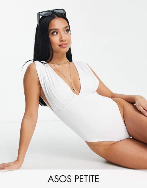 ASOS DESIGN Petite - Hvid rynket badedragt med plunge
