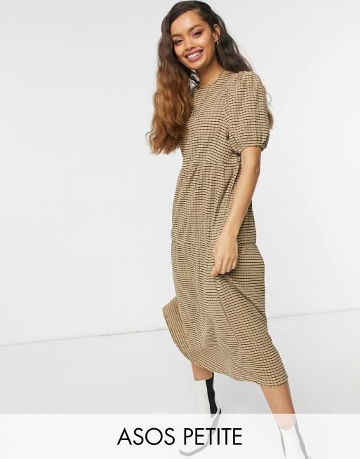 ASOS DESIGN Petite - Lagdelt smock-midikjole med kamelbrune og sorte tern