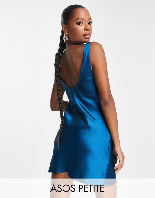 ASOS DESIGN Petite - Mini-slipkjole med dyb udskæring i safirblå satin