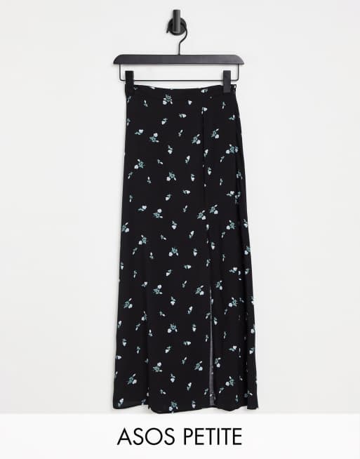 ASOS DESIGN Petite - Sort midinederdel med høj slids ved låret og blomsterprint