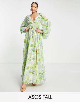ASOS DESIGN Tall - Blød maxikjole med rynket talje og åben ryg i gult og blåt blomstermønster
