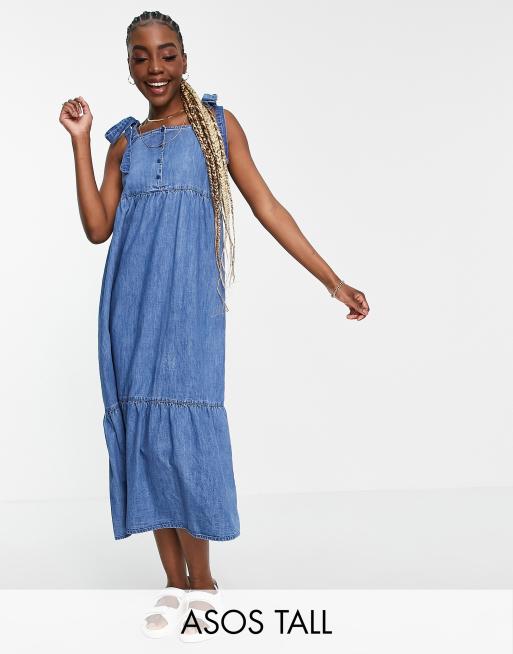 ASOS DESIGN Tall - Lagdelt midikjole i mellemvasket blød denim