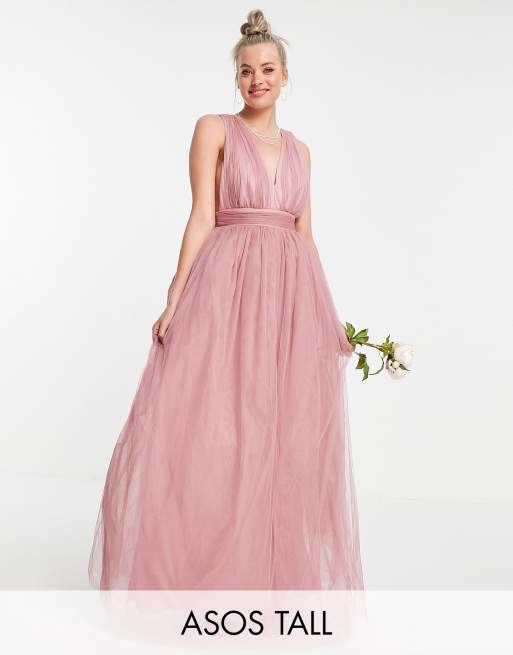 ASOS DESIGN Tall maxikjole i tyl med dyb udskæring og sløjfe bagpå i rosa