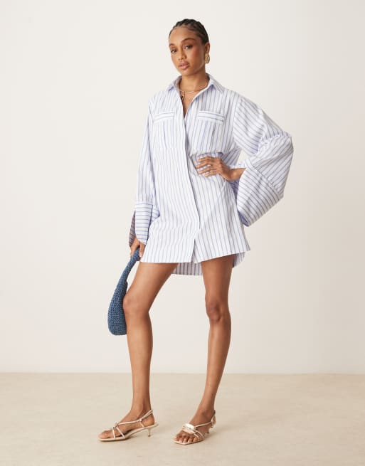ASOS DESIGN Tall - Mini-skjortekjole med brede manchetter, store lommer og blå striber