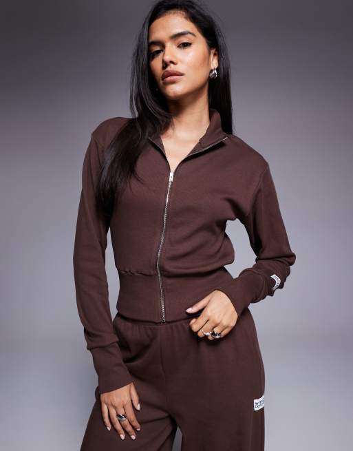Weekend Collective - Ribstrikket chokoladebrun sweatshirt med ståkrave og lynlås - Del af sæt