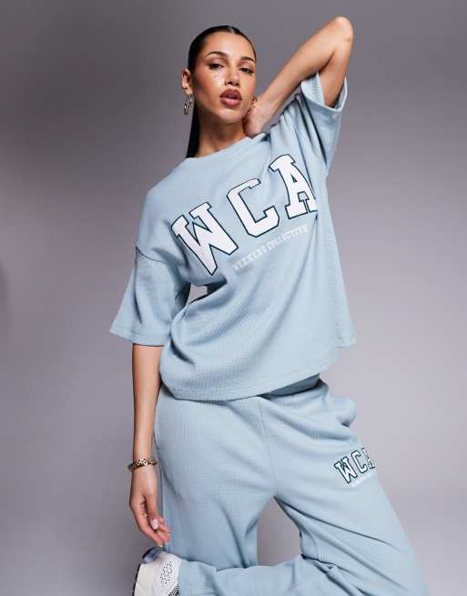 Weekend Collective - Vasket salviegrøn top med vaffelstruktur og college-logo - Del af sæt