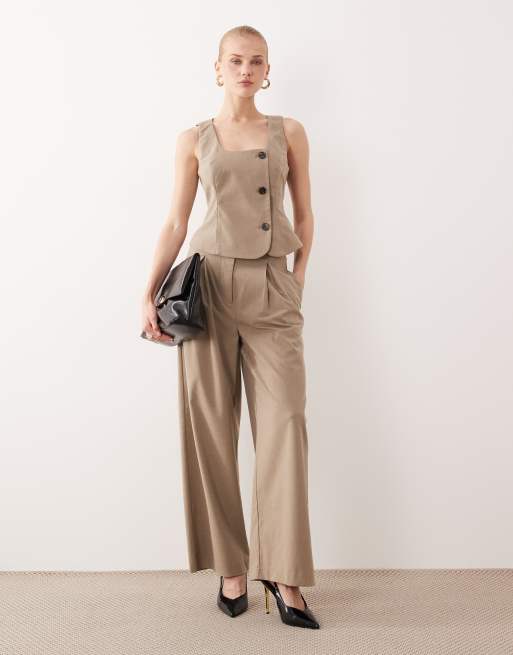 AWARE - Meleret beige sæt med asymmetrisk habitvest med knapper og bukser med vide ben og dybe læg