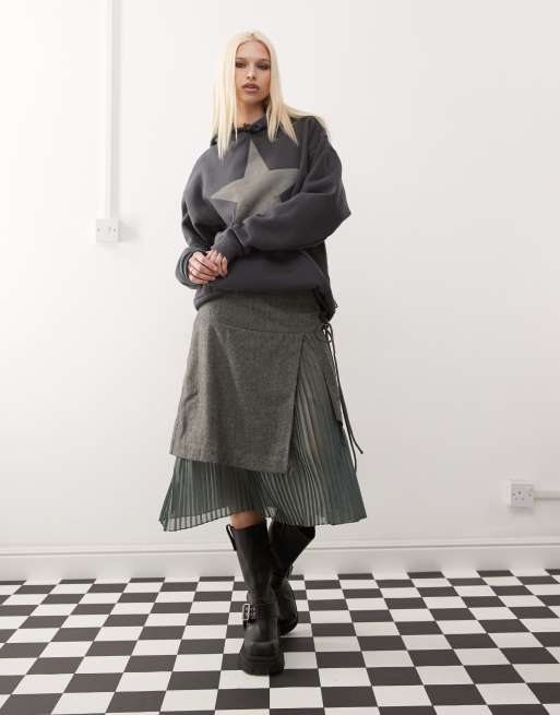 Basic Pleasure Mode - Kakigrøn kilt-midinederdel med tweed-overlag
