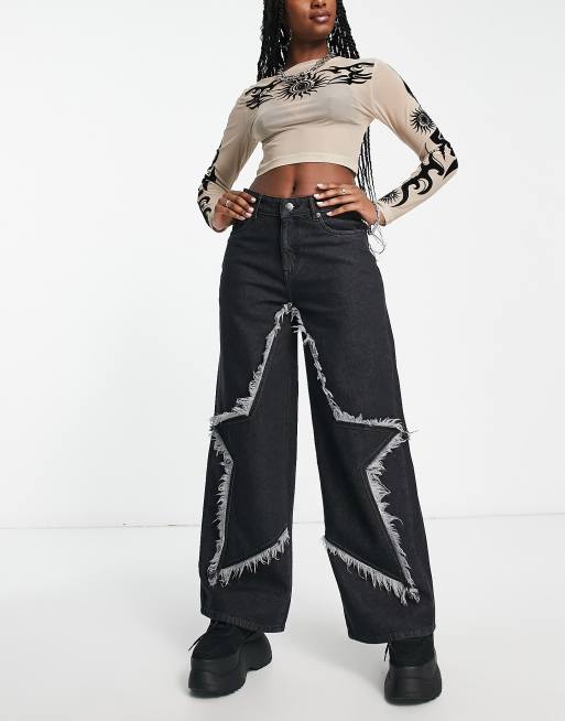 Basic Pleasure Mode - Mørkegrå, oversized jeans med flosset stjernedesign
