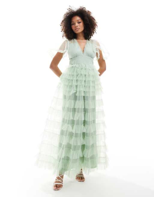 Beauut - Brudepiger - Salviegrøn maxikjole med V-hals og flæseskørt