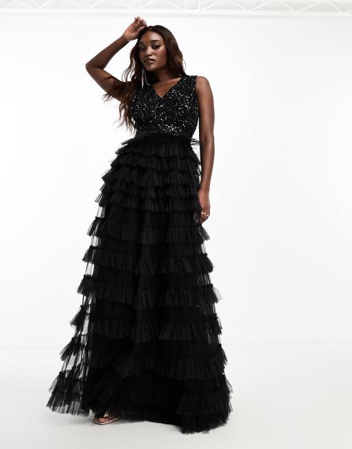 Beauut - Sort udsmykket maxikjole med V-hals og lagdelt nederdel