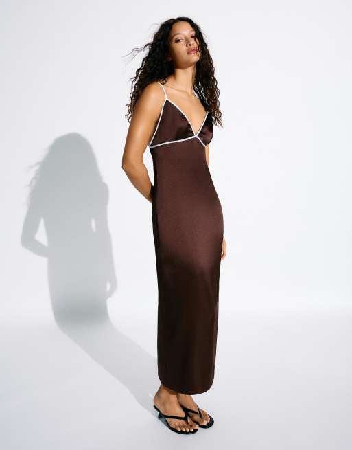 Bershka - Brun midikjole med i satin med kontraster