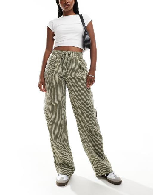 Bershka - Bukser med vide ben og utility-lomme samt bindebånd i taljen i kakigrønne striber