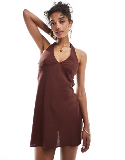 Bershka - Chokoladebrun minikjole i hør med halterneck