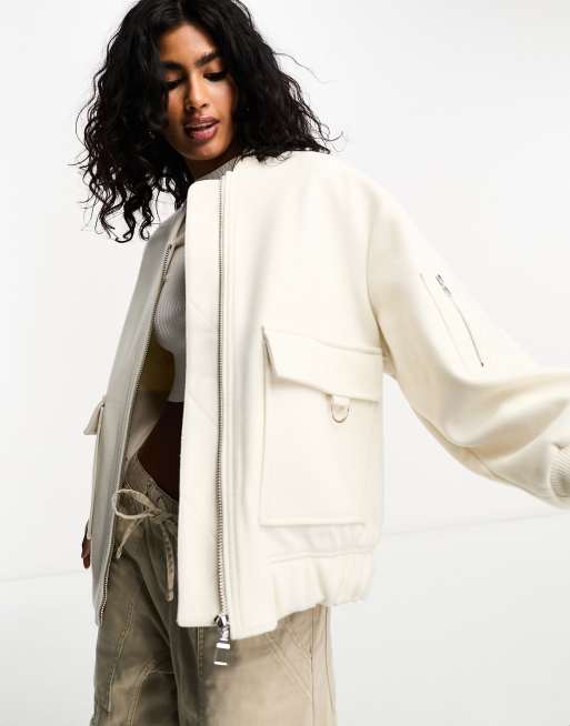 Bershka - Ecrufarvet bomber-jakke med uldlook