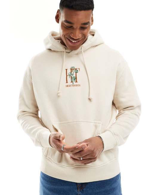 Bershka - Ecrufarvet hættetrøje med blomstergrafik på brystet