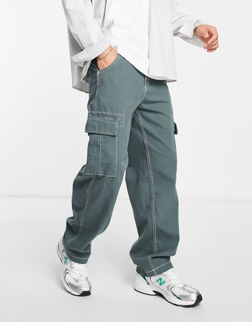 Bershka - Grå cargobukser med vide ben og kontrastsyninger