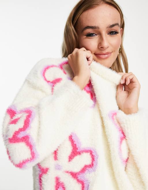 Bershka - Hvid fluffy trøje med stort blomstermønster og logo