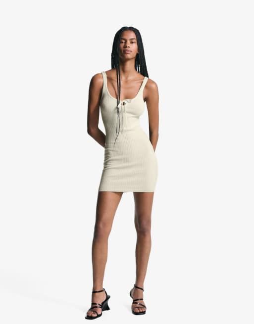 Bershka - Hvid minikjole med tynde stropper og bindebåndsdetalje