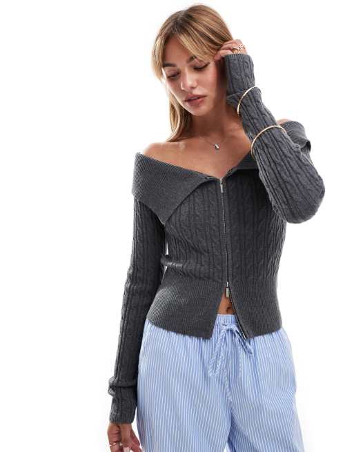 Bershka - Kabelstrikket bardot-trøje med lynlås foran i grå