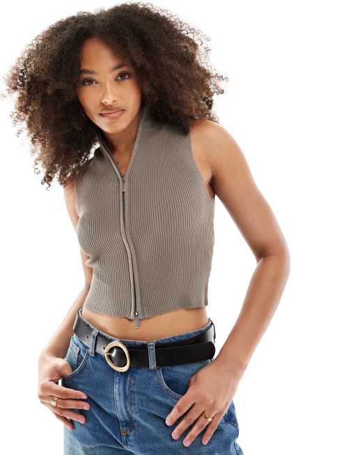 Bershka - Kakigrøn top med høj hals og lynlås i fin strik