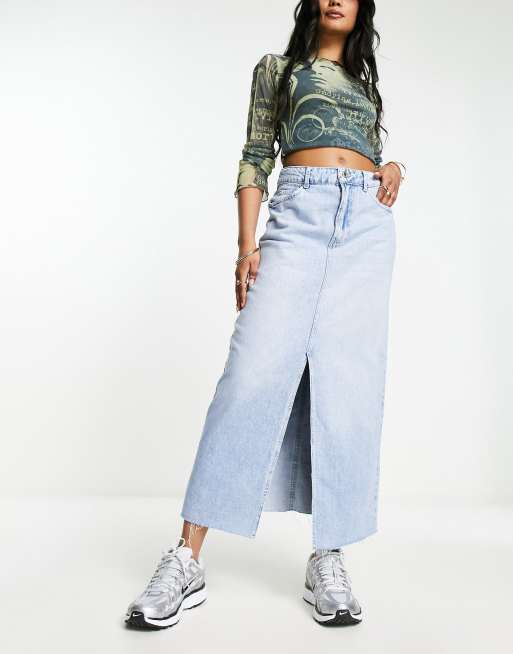 Bershka - Lyseblå midinederdel i denim med slids foran
