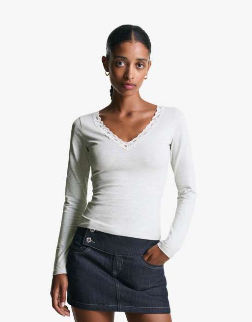 Bershka - Lysegrå og langærmet T-shirt med blondekant