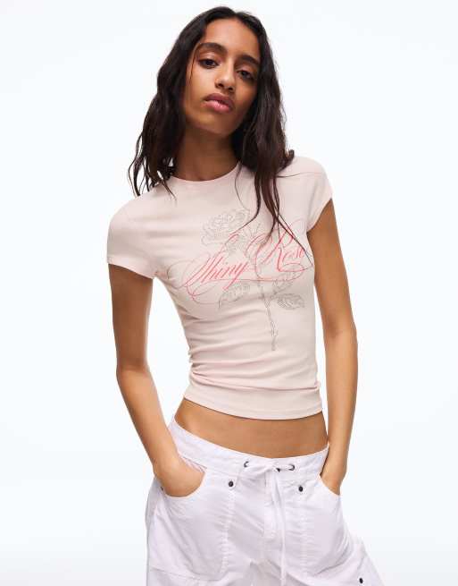 Bershka - Lyserød kortærmet T-shirt med rhinsten