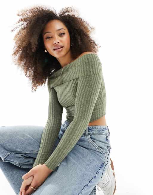Bershka - Ribstrikket bardot-top i kakigrøn jersey