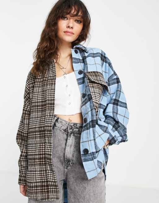 Bershka - Skjortejakke med splejset design i brune og blå tern