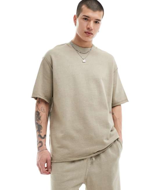 Bershka - T-shirt med rå kant i vasket beige - Del af sæt