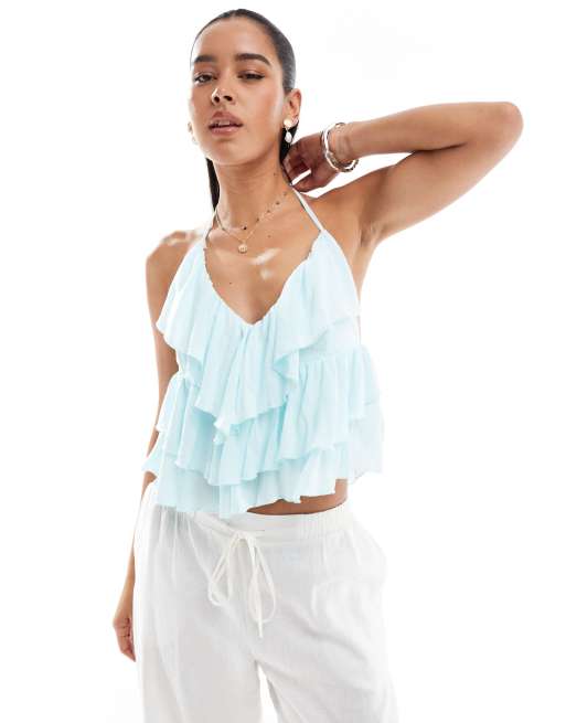 Bershka - Turkis top med halterneck og flæser i krølstof